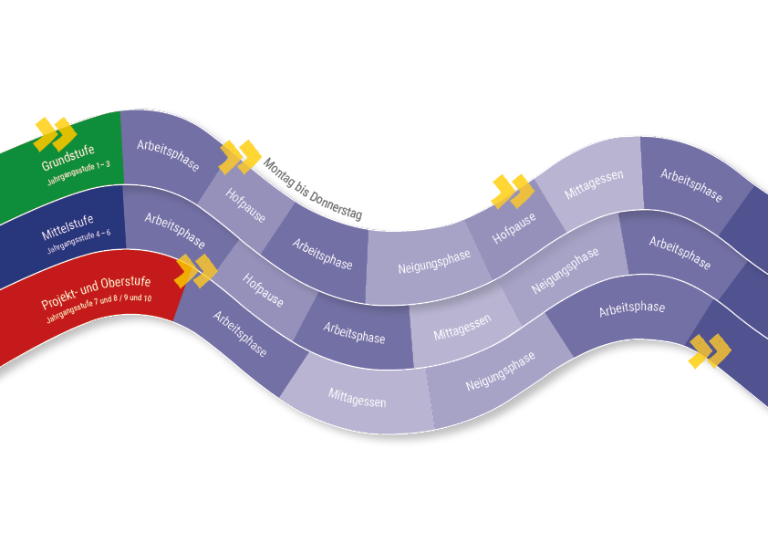 Mit Beginn des Schuljahres 2023/2024 wurde die neue rhythmisierte Tagesstruktur nun in allen Klassen, von der 1. Klasse bis zur 10. Klasse, eingeführt. Dieser wellen- förmige Rhythmus ermöglicht es, dass alle Schüler*innen ihren Schulalltag als eine ausgewogene Mischung aus konzentriertem Arbeiten, Erholungspausen und Entwicklung individueller Interessen in den Neigungsphasen erleben.